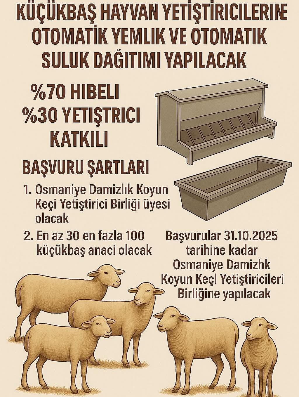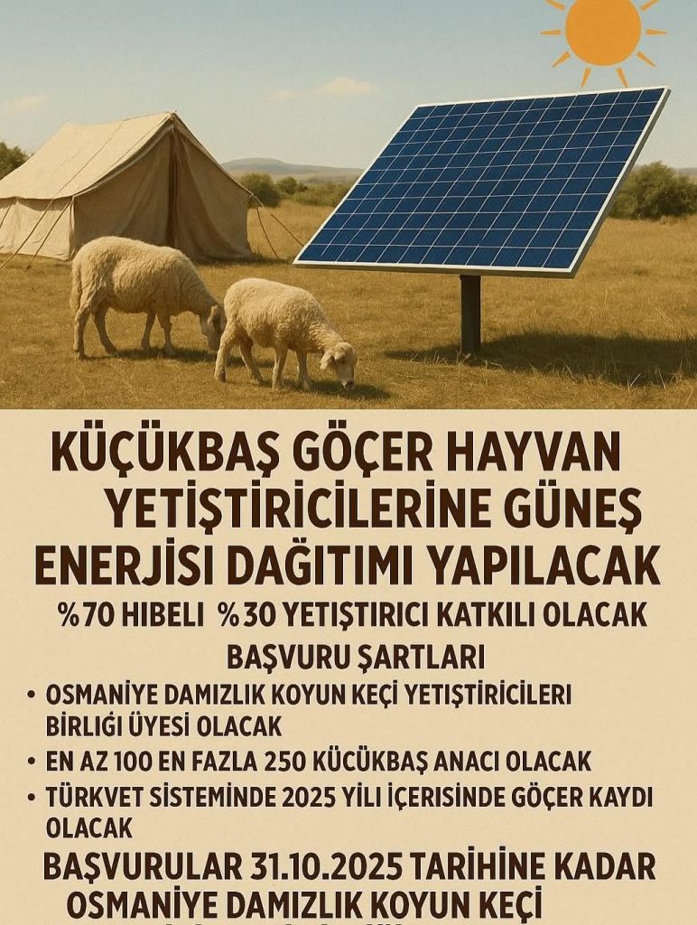 Değerli üyelerimiz Göçer Yetiştiricilerimize dağıtılacak olan Güneş Enerjisi Sistemi (Sisteme kayıtlı en az 100 anaç en fazla 250 anaç hayvan) ve Otomatik Yemlik ve otomatik Suluk Makine Ekipmanı (Sisteme kayıtlı en az 30 anaç en fazla 100 anaç hayvan) Makine ekipman dağıtımından yararlanmak için 31 Ekim 2025 Cuma gününe kadar birliğimize başvurmanız gerekmektedir!
